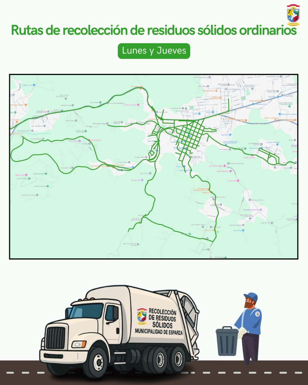 Ruta de los días Lunes y Jueves: Se recolectan las comunidades de Esparza este, el Chingo, Esparzol, El Tejar, Los Cedros, Estados Unidos, Esparza oeste, la Granja, Mojón y Mojoncito
