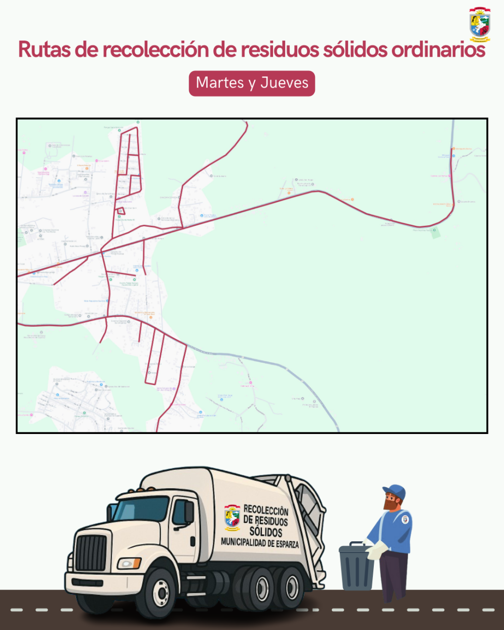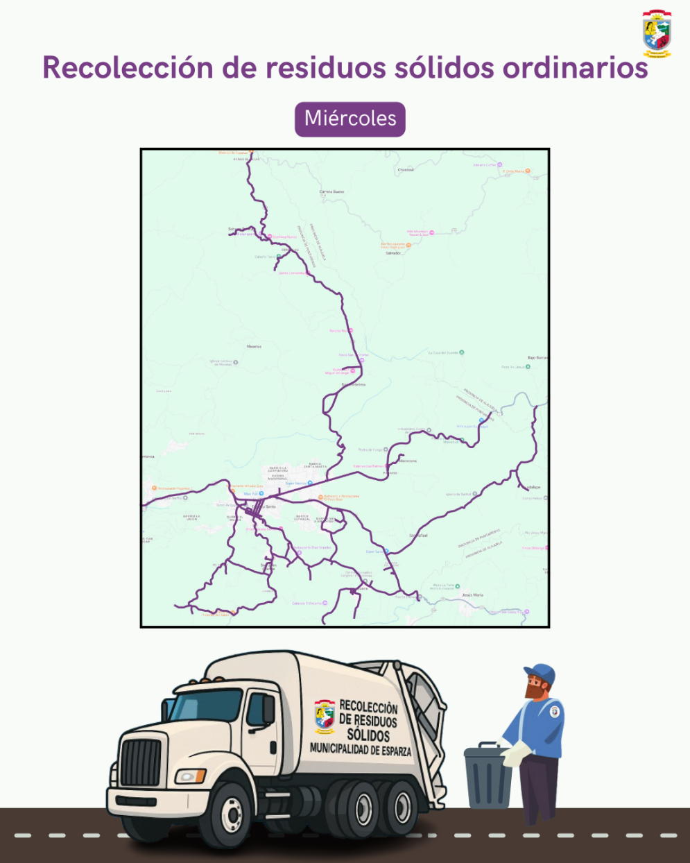 Ruta de los días Lunes y Jueves: Se recolectan las comunidades de Esparza este, el Chingo, Esparzol, El Tejar, Los Cedros, Estados Unidos, Esparza oeste, la Granja, Mojón y Mojoncito