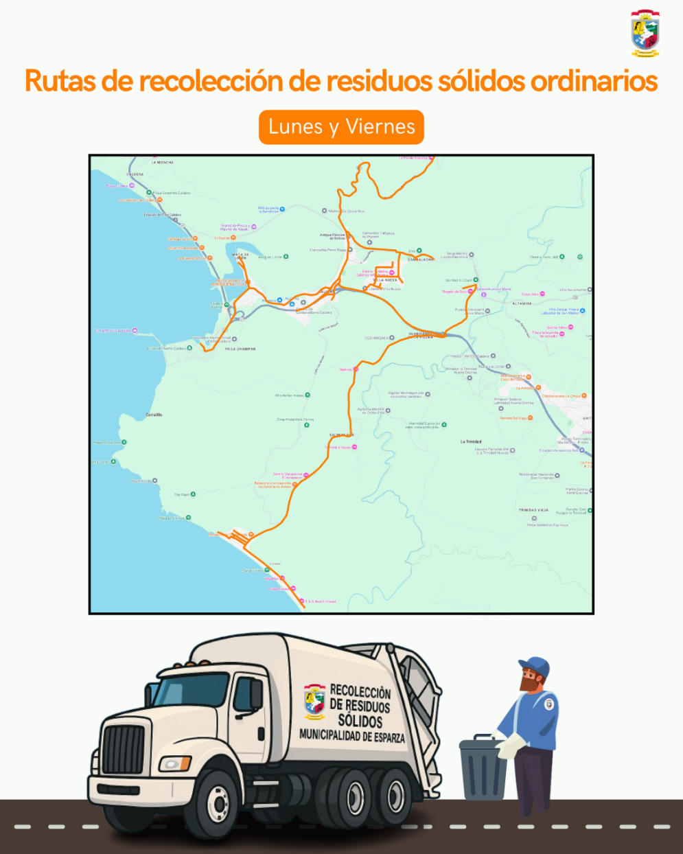 Ruta de los Lunes y Viernes: Se recolectan las comunidades de Salinas, Tivives, Villanueva, Mata de Limón, Caldera, Incop, Guardacostas, Pedregañ, Doña Ana