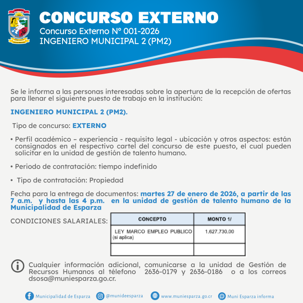 Dirección Municipalidad: Puntarenas, Esparza, Espíritu Santo, 25 metros al este de Correos de Costa Rica.